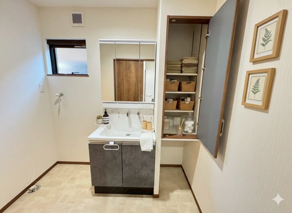 洗面室にはタオルなどを入れることのできる収納…